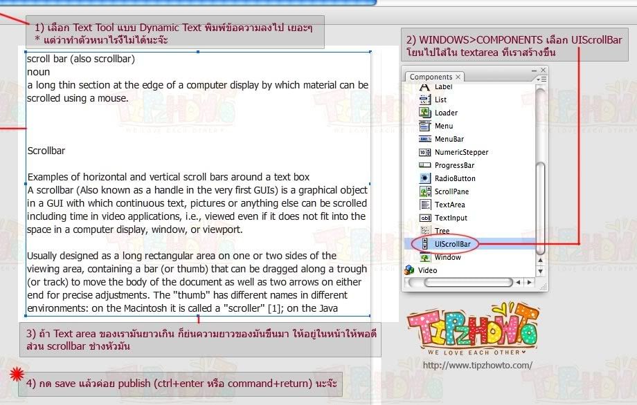 - ตั้งชื่อกำกับ mc 3 ตัว ตามรูป : txt_message, area_message, และ thumb (ตัวที่เราจะลาก/ ตั้งใน mc ชื่อ scroll_bar นะจ๊ะ)